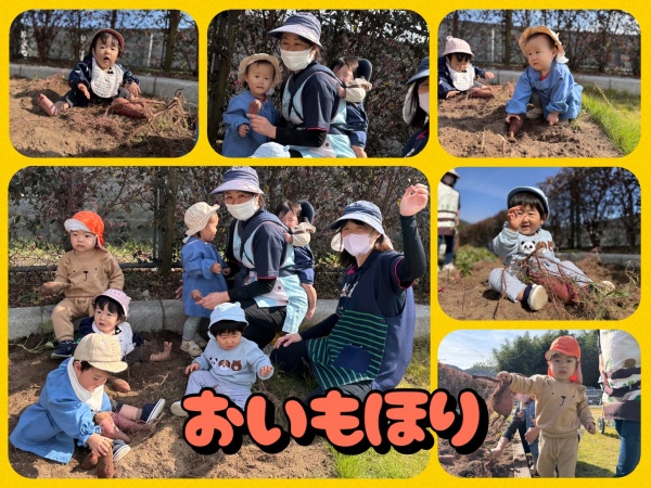 畑には大きなお芋さんがかくれていました。0歳児さんは、初めてのお芋ほり。お芋や畑の土に触れると渋い表情になってました(笑)ここで大活躍したのは1歳児さんのお兄さん。よいしょ!よいしょ!と大きなおいもさんをたくさん掘ってくれました♪