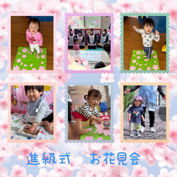 お花見会ではお花見サーキット遊びで「早くやりたい!」とワクワク順番を待つ子どもたち。自分の写真の妖精を探して「あったよ!」と嬉しそうに見せてくれました♪お給食は可愛いくまさんパックに詰めてパクパク食べられました。楽しいお花見会ができました。