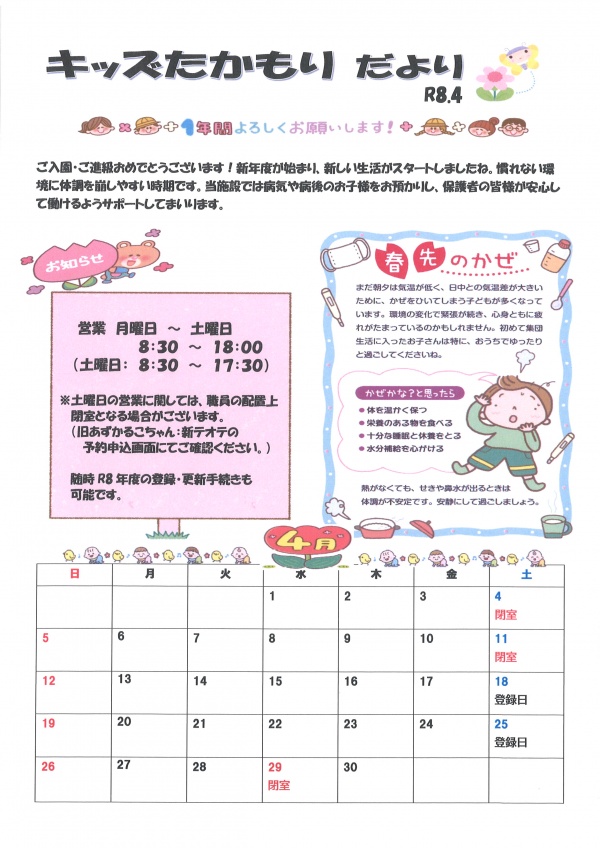 キッズたかもりだより 令和8年4月号掲載です!