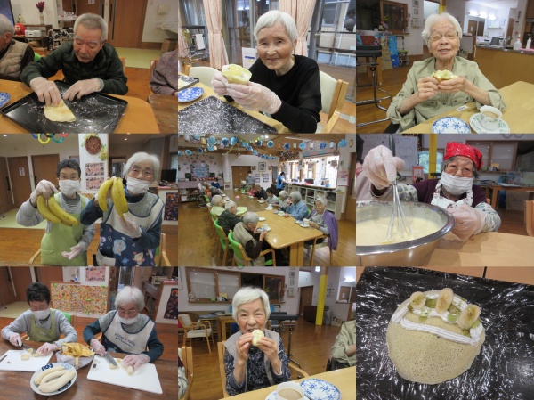 バナナを薄く斜めに切って皆さんと協力して行いました!(^^)!
