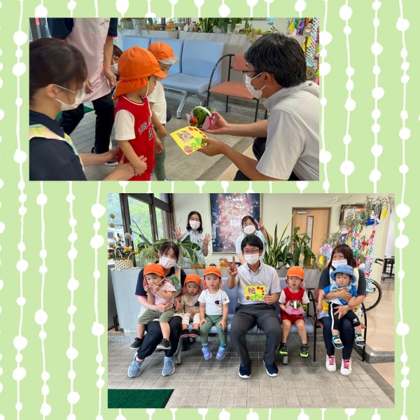 今日は野菜の収穫祭です!”大きくなあれ”とお水をあげて美味しそうなお野菜ができました。お天気は雨でしたが雨の日のお散歩を楽しみながら高森苑さんへレッツゴー!!
