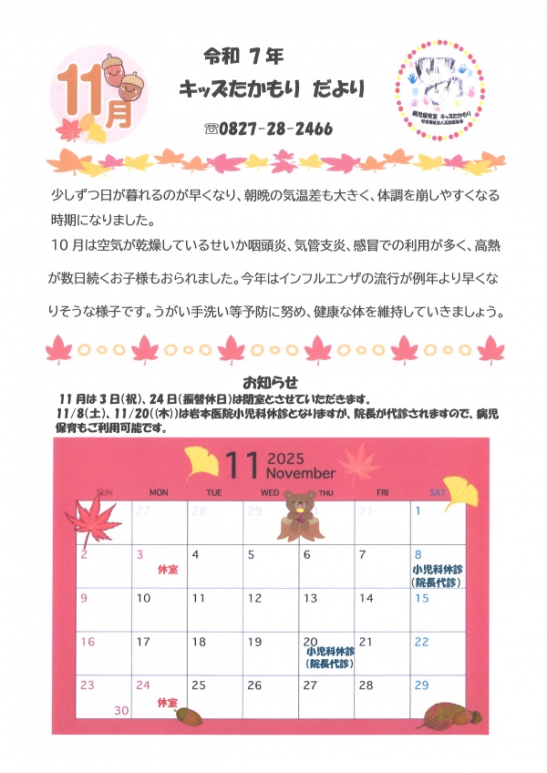 11/8(土)、11/20(木)は岩本医院小児科休診になりますが、院長が代診し、病児保育室もご利用可能です。あらかじめご了承ください。